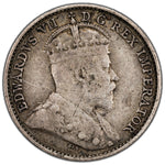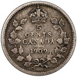 Available for sale is a Canada 1909 Round Leaves Cross/Bow Tie 5 Cents Silver Coin - VG-10 (scratches)
