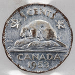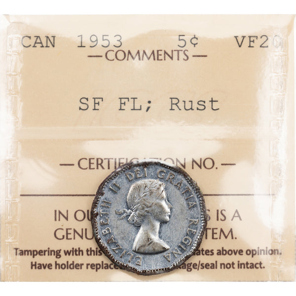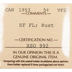 Available for sale is a Canada 1953 Mule SF FL 5 Cents Coin - ICCS VF-20 (rust)