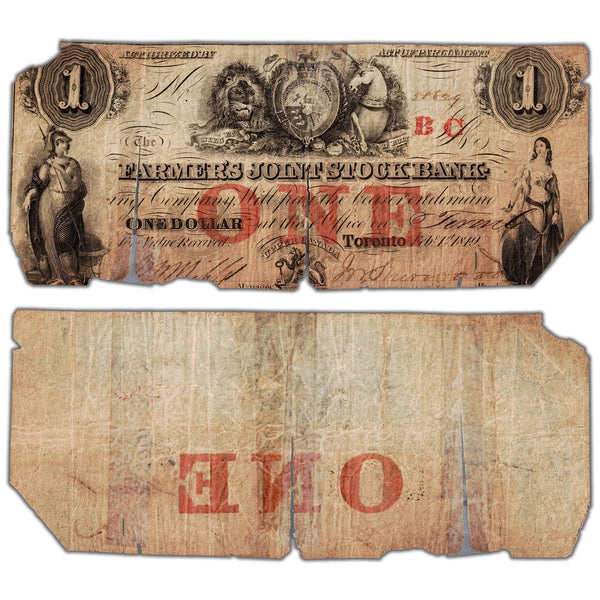 Available for sale is a $1 1849 Farmer's Joint Stock Bank Note #280-14-04-02 - Heavily Damaged Country: Canada - The Farmer's Joint Stock Bank Year: 1849 Denomination: 1 Dollar Variety:...