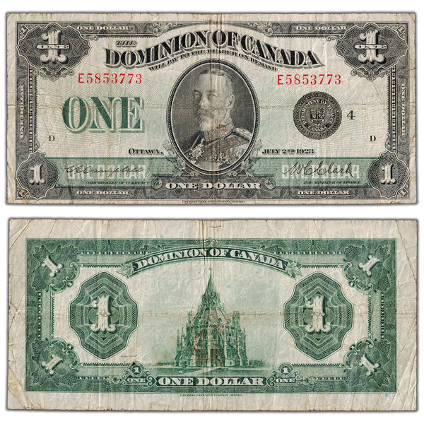 Available for sale is a $1 1923 Dominion of Canada Note Black Seal Series E DC-25o - Fine