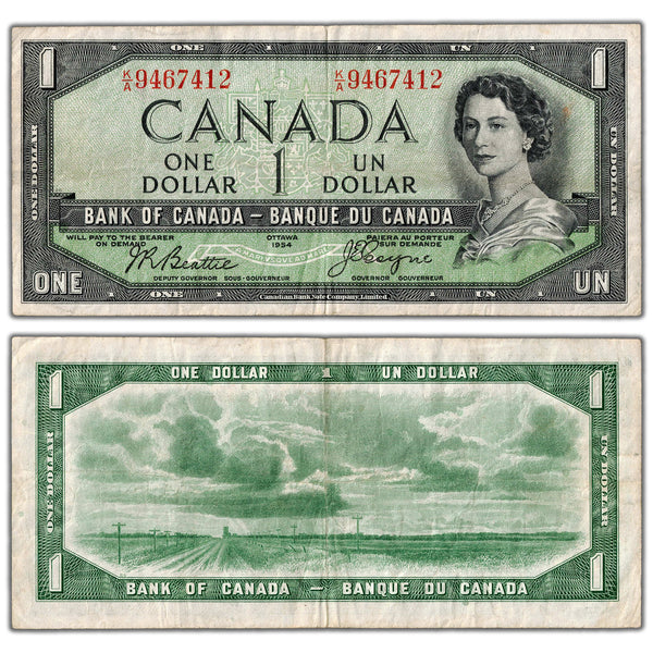 Available for sale is a $1 1954 Bank of Canada Note Devil Face K/A Prefix BC-29b - VF