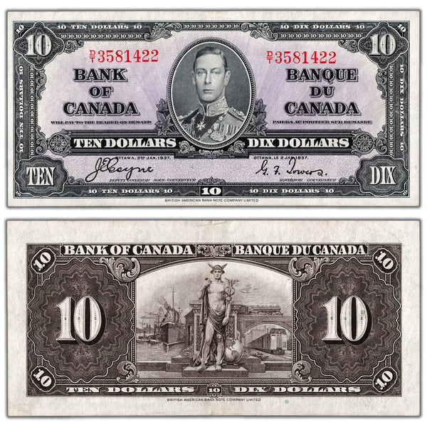 Available for sale is a $10 1937 Bank of Canada Note Coyne-Towers D/T Prefix BC-24c - EF/AU Country: Canada Year: 1937 Denomination: 10 Dollars Signatures: Coyne-Towers Prefix/Series: D/T Catalogue: Charlton...