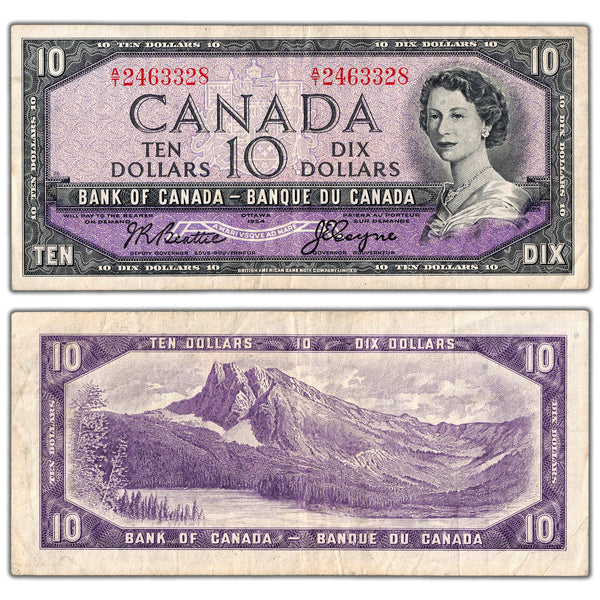 Available for sale is a $10 1954 Bank of Canada Note Beattie-Coyne A/T Prefix BC-40a - VF