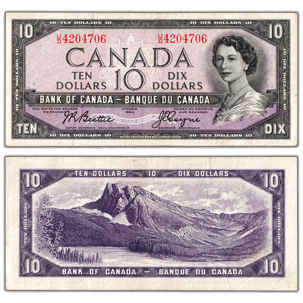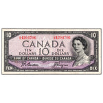 Available for sale is a $10 1954 Bank of Canada Note Beattie-Coyne U/D Prefix BC-40a - VF+