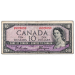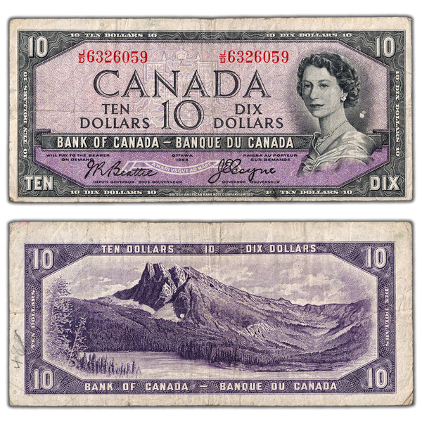 Available for sale is a $10 1954 Bank of Canada Note Devil Face J/D Prefix BC-32b - F/VF