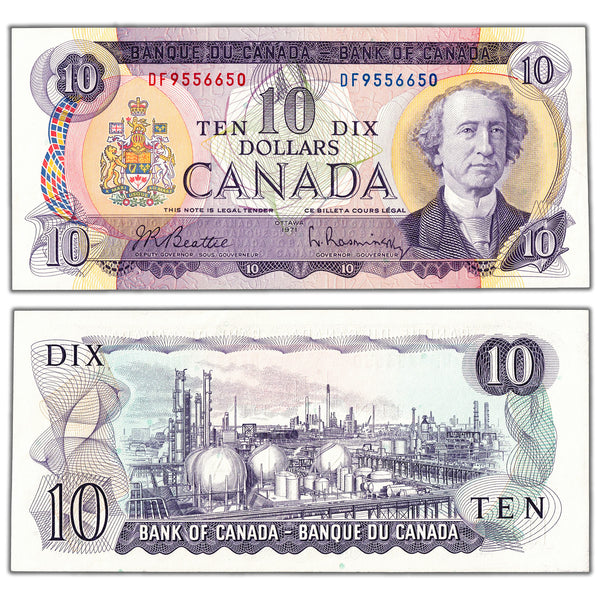 Available for sale is a $10 1971 Bank of Canada Note Beattie-Rasminsky DF Prefix BC-49a - AU-58