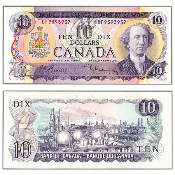 Available for sale is a $10 1971 Bank of Canada Note Beattie-Rasminsky DF Prefix BC-49a - Ch UNC