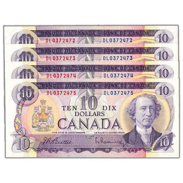 Available for sale is a $10 1971 Bank of Canada Notes DL Short Run Prefix BC-49a - 4 Consecutive AU-58 Country: Canada Year: 1971 Denomination: 10 Dollars Signatures: Beattie-Rasminsky Prefix/Series:...