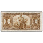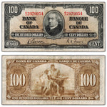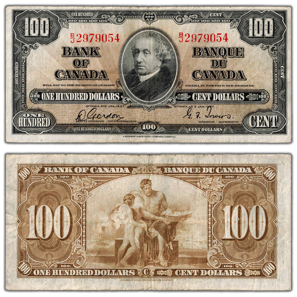 Available for sale is a $100 1937 Bank of Canada Note Gordon-Towers B/J Prefix BC-27b - Staple Hole