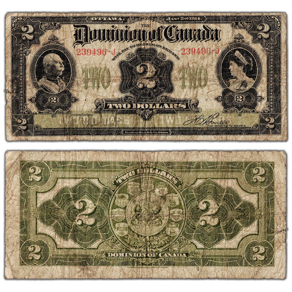 SOLD $2 1914 Dominion of Canada Note No Seal Curved Line Series J DC-22a-i - Circulated
