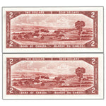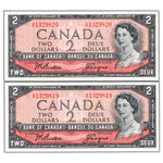 Available for sale is a $2 1954 Bank of Canada Notes A/R Prefix BC-38a - 2 Consecutive AU-58
