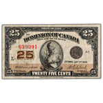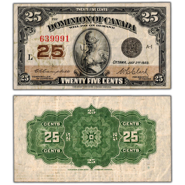 Available for sale is a 25 Cents 1923 Dominion of Canada Shinplaster Note DC-24d - F/VF Country: Canada - The Dominion of Canada Year: 1923 Denomination: 25 Cents Signatures: Campbell-Clark...