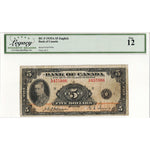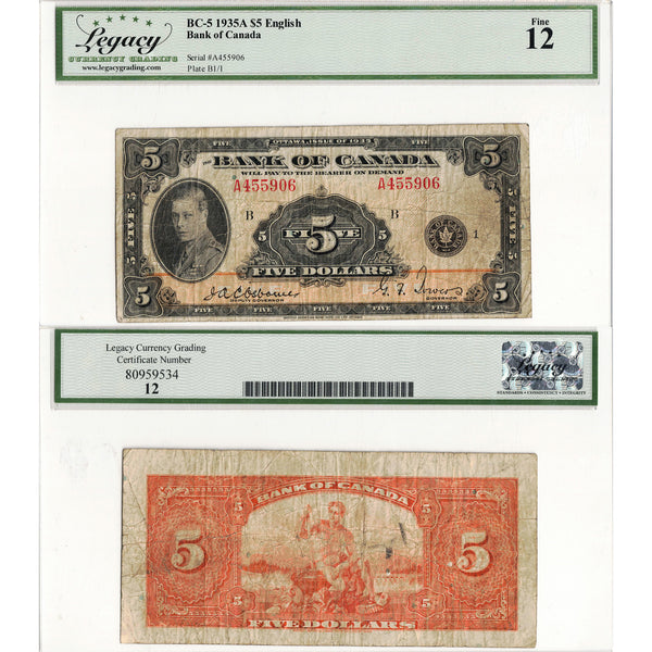 Available for sale is a $5 1935 Bank of Canada Note English Text BC-5 - Legacy F-12