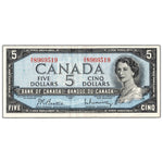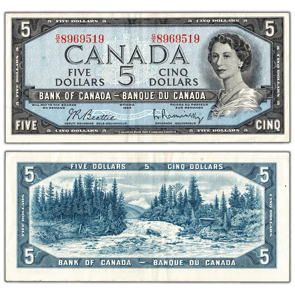 Available for sale is a $5 1954 Bank of Canada Note Beattie-Rasminsky G/X Prefix BC-39b - VF/EF