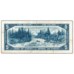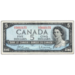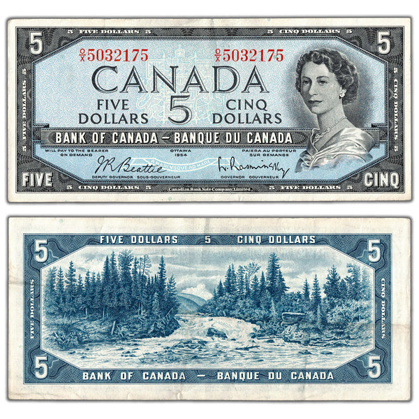 Available for sale is a $5 1954 Bank of Canada Note Beattie-Rasminsky O/X Prefix BC-39b - VF/EF