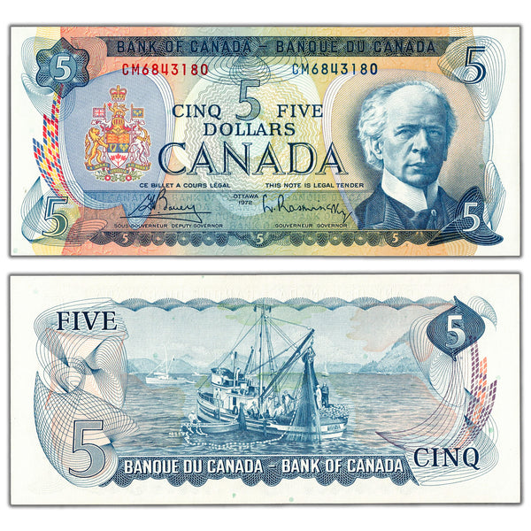Available for sale is a $5 1972 Bank of Canada Note Bouey-Rasminsky CM Prefix BC-48a - UNC