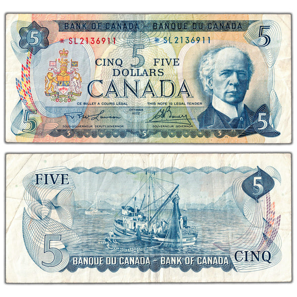 Available for sale is a $5 1972 Bank of Canada Note *SL Replacement Prefix BC-48bA - F/VF