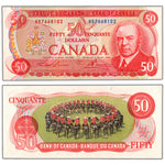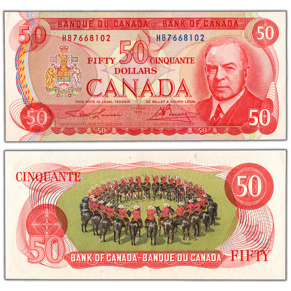 Available for sale is a $50 1975 Bank of Canada Note Lawson-Bouey HB Prefix BC-51a - AU-58
