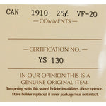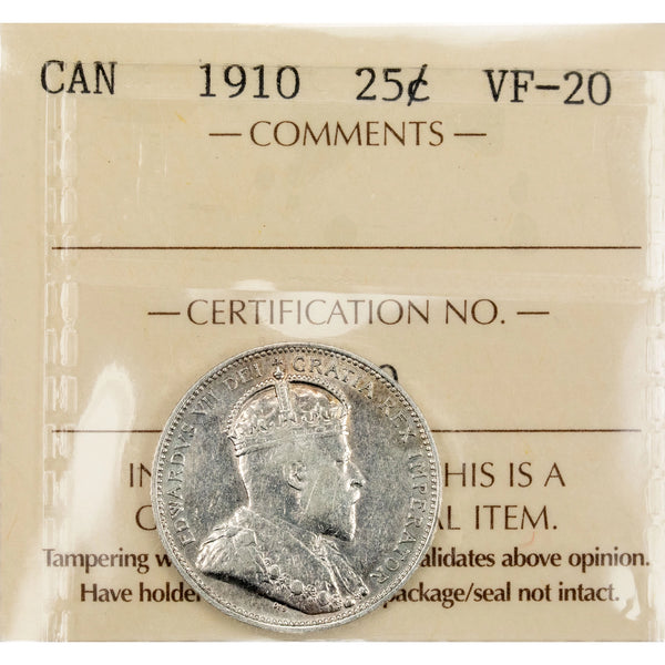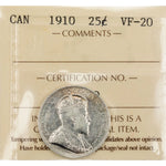 Available for sale is a Canada 1910 25 Cents Quarter Silver Coin - ICCS VF-20