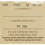 Available for sale is a Canada 1922 5 Cents Nickel Coin - ICCS MS-63