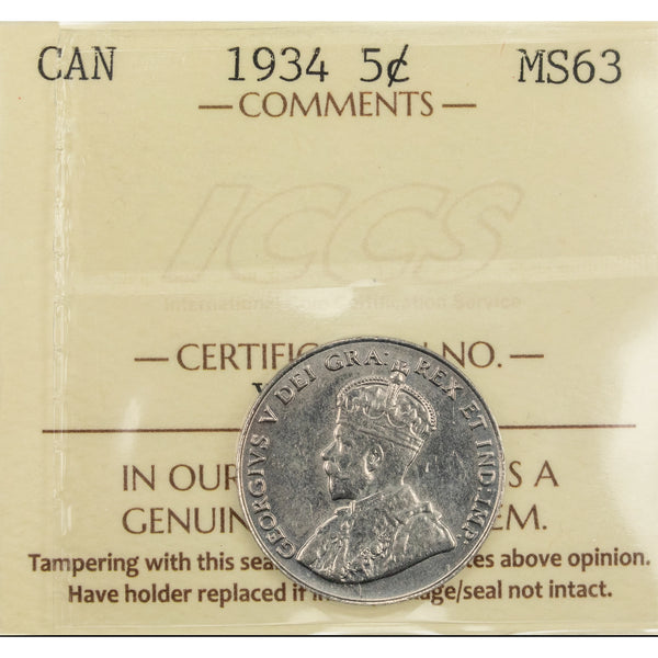 Available for sale is a Canada 1934 5 Cents Nickel Coin - ICCS MS-63
