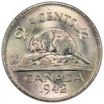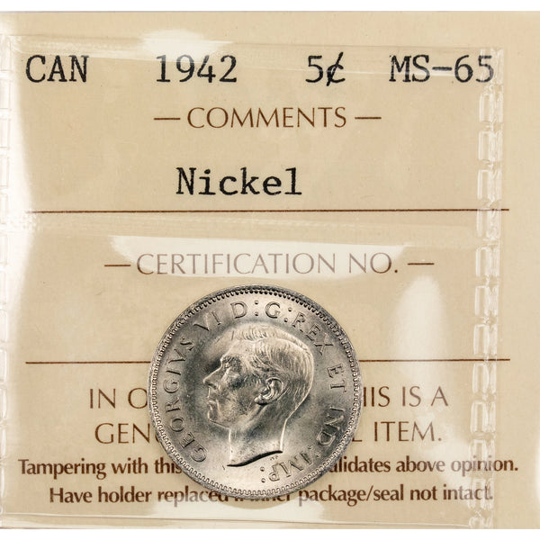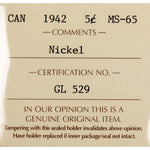 Available for sale is a Canada 1942 5 Cents Nickel Coin - ICCS MS-65