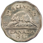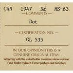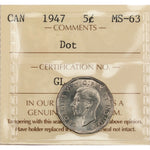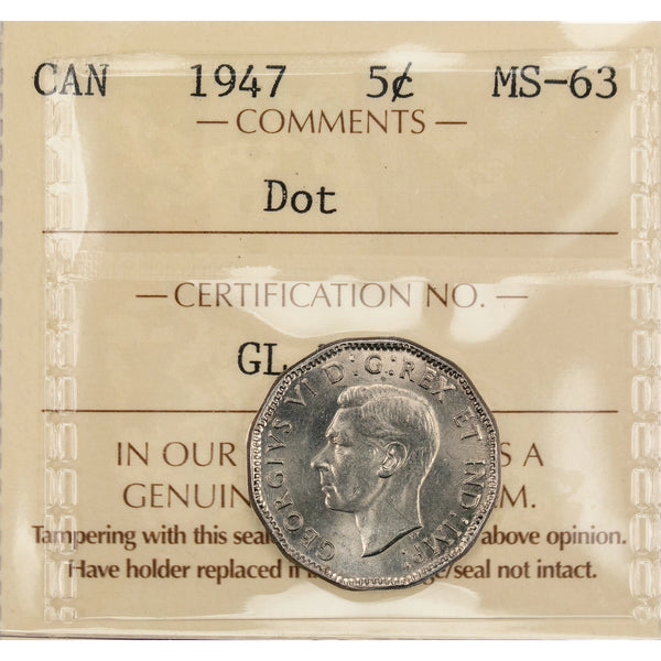 Available for sale is a Canada 1947 Dot 5 Cents Nickel Coin - ICCS MS-63