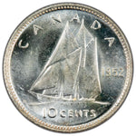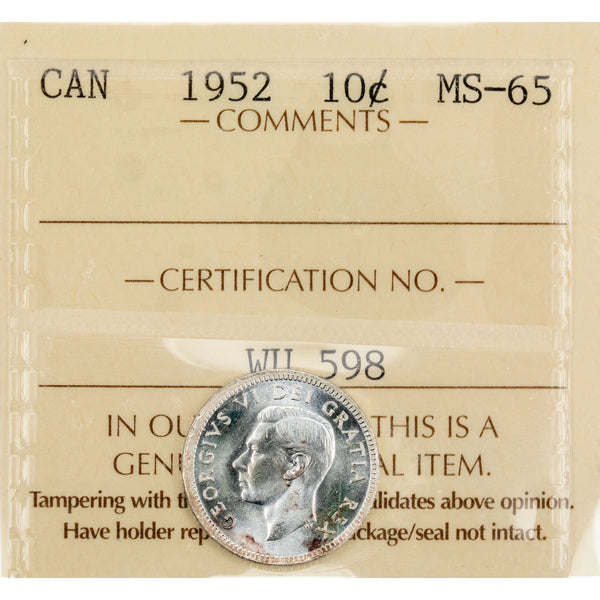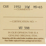 Available for sale is a Canada 1952 10 Cents Dime Silver Coin - ICCS MS-65