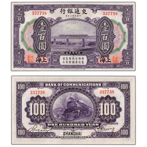 Available for sale is a China Bank of Communications Shanghai 1914 100 Yuan Note P #120c - AU-58