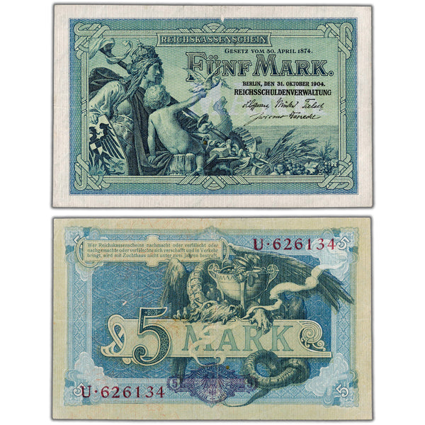 Available for sale is a Germany 1904 5 Five Mark Note P #8a - VF