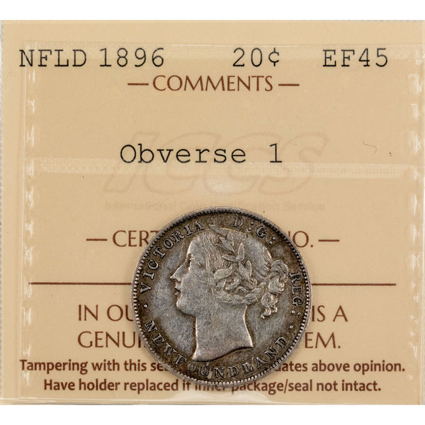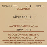 Available for sale is a Newfoundland 1896 Obverse #1 20 Cents Silver Coin - ICCS EF-45