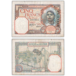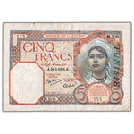 Available for sale is a Tunisia 1941 5 Five Francs Note P #8c - Writing
