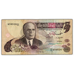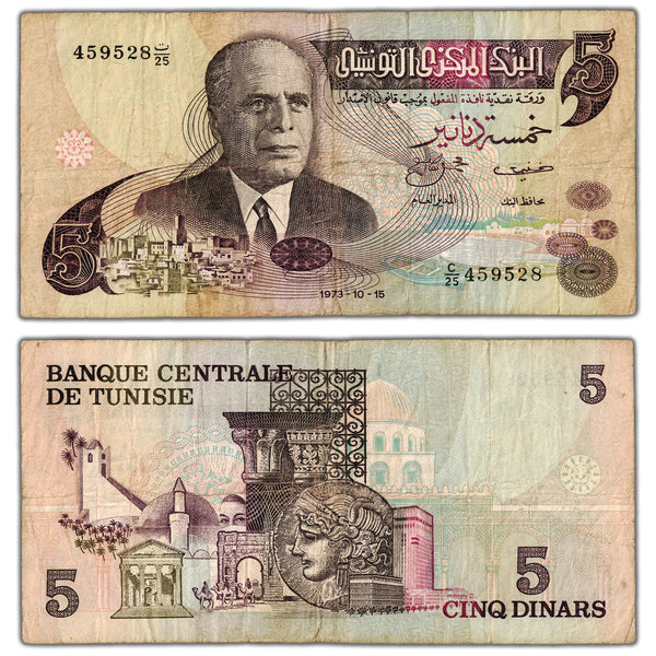 Available for sale is a Tunisia 1973 5 Five Dinars Note P #71 - Circulated  Country: Tunisia Year: 1973 Denomination: 5 Dinars Catalogue: Pick #71 Grade: Circulated  Serial/SKU: 459528