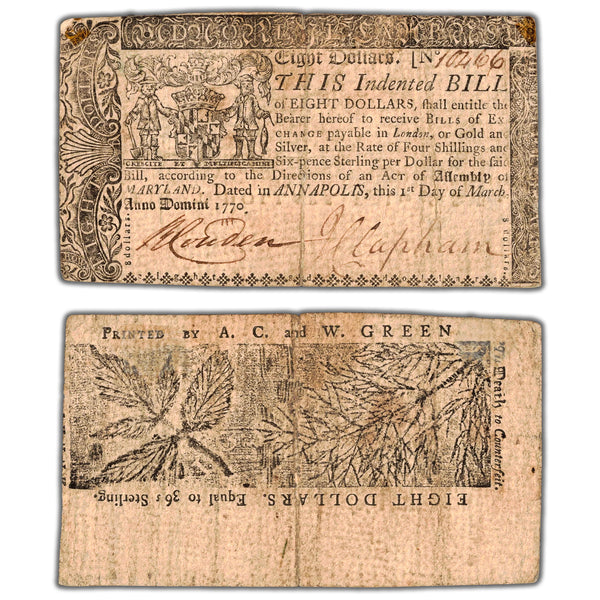 Available for sale is a United States 1770 $8 Maryland Colonial Currency Note - Circulated
