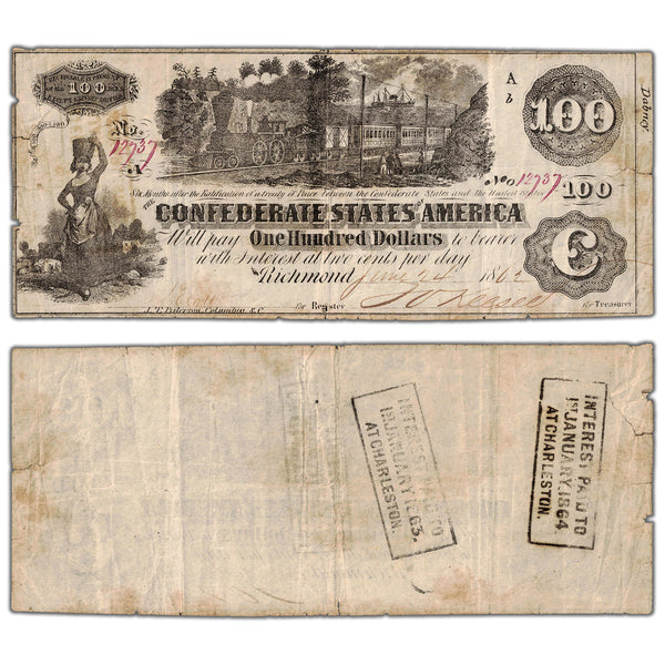 Available for sale is a United States 1862 $100 Confederate States Note - Two Interest Stamps