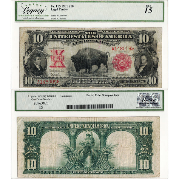Available for sale is a United States 1901 $10 Legal Tender "Bison" Note Fr. 115 - Legacy F-15