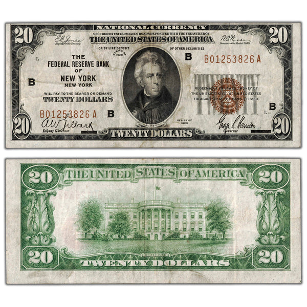 Available for sale is a United States 1929 $20 New York, NY National Currency Note - Circulated
