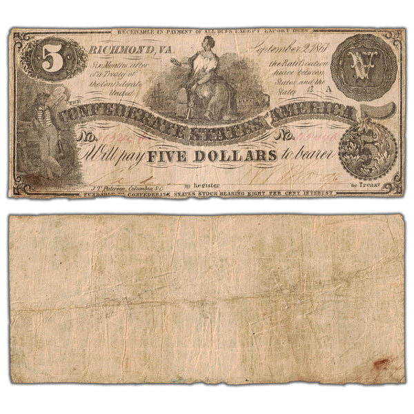 Available for sale is a United States 1861 Confederate States of America $5 Five Dollars Note - Cut Cancelled