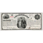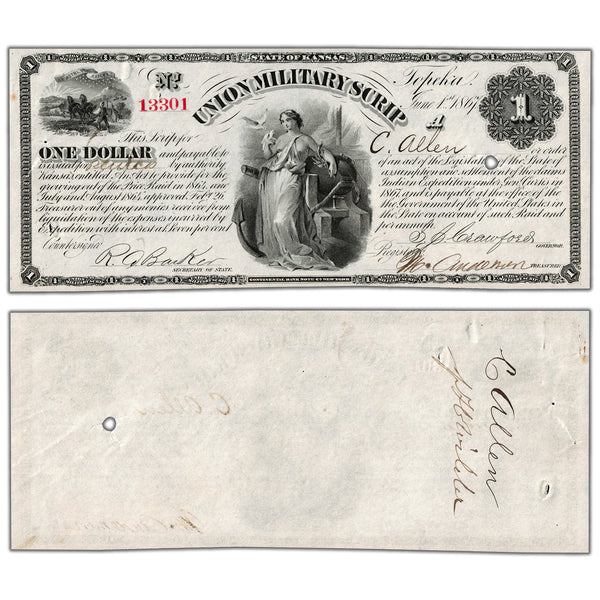 Available for sale is a United States 1867 $1 Union Military Scrip Kansas Note