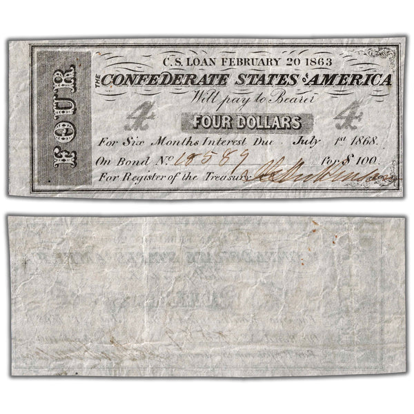 Available for sale is a United States 1868 $4 Bond Coupon - Circulated  Country: United States  Year: 1868 Denomination: 4 Dollars Variety: Bond Coupon Grade: Circulated Serial/SKU: US310