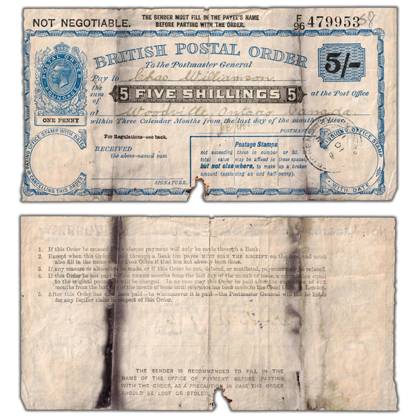 Available for sale is a Great Britain George V 5 Five Shillings British Postal Order - Damaged