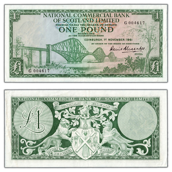 Available for sale is a Scotland National Commercial Bank 1961 1 Pound Note P #269 - VF/EF