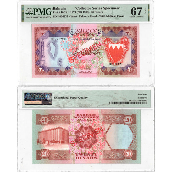 Available for sale is a Bahrain 1973 (ND 1978) 20 Dinars Note P #10CS1 - PMG Superb UNC-67 EPQ