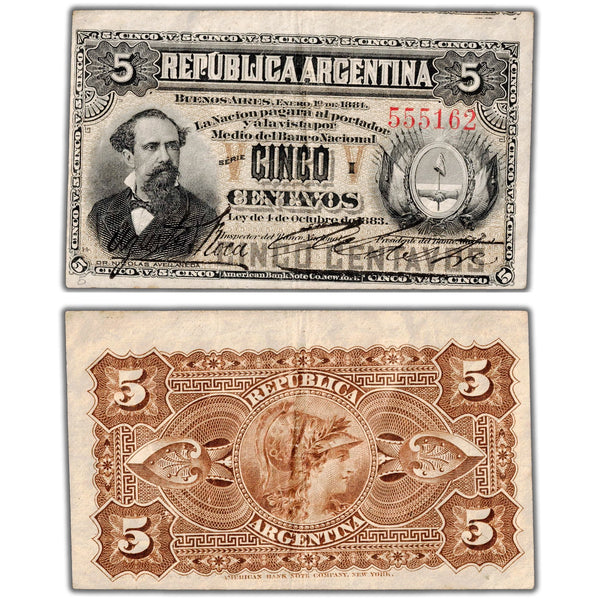 Available for sale is a Argentina 1884 5 Five Centavos Note P #5 - VF+ Country: Argentina  Year: 1884 Denomination: 5 Centavos Catalogue: Pick #5 Grade: VF+ Serial/SKU: 555162