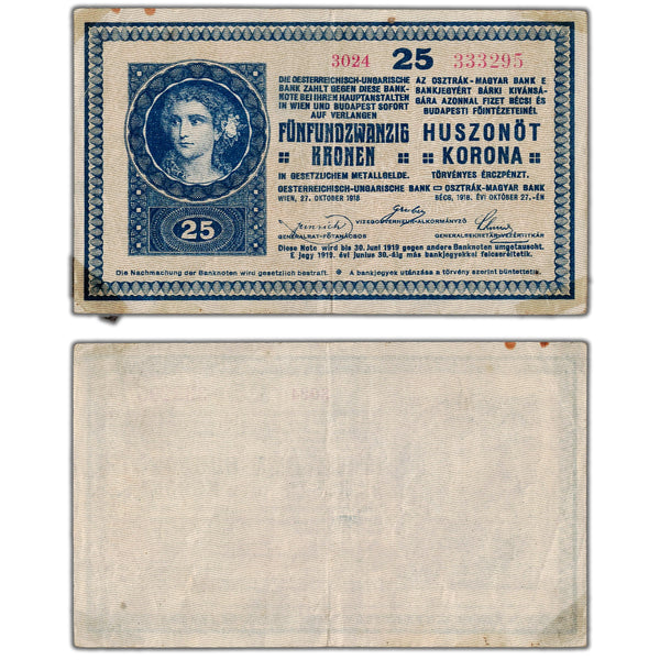 Available for sale is a Hungary 1918 25 Kronen Note P #13 - VF (tape)