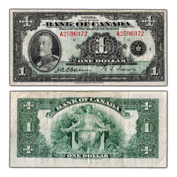 Available for sale is a $1 1935 Bank of Canada Note English Text Letter 'A' BC-1 - F/VF