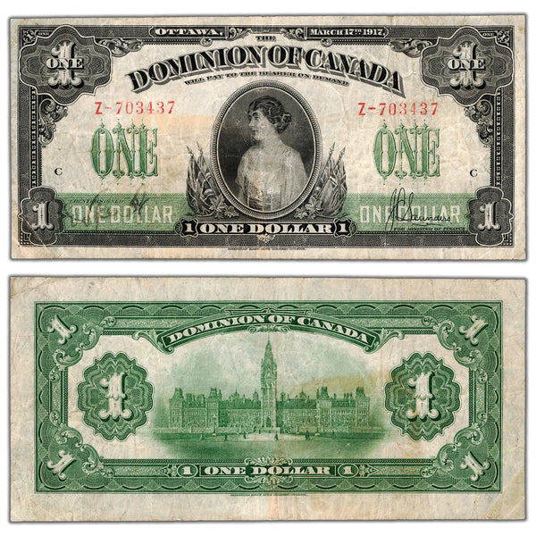 Available for sale is a $1 1917 Dominion of Canada Note Saunders No Seal Series Z DC-23b - VF (stained)