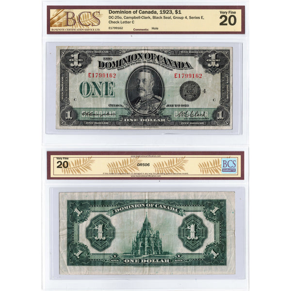 Available for sale is a $1 1923 Dominion of Canada Note Black Seal Series E DC-25o - BCS VF-20