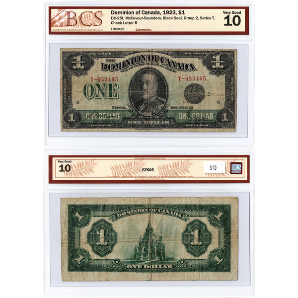 Available for sale is a $1 1923 Dominion of Canada Note Black Seal Series T DC-25f - BCS VG-10 SKU: T-953495