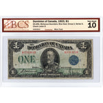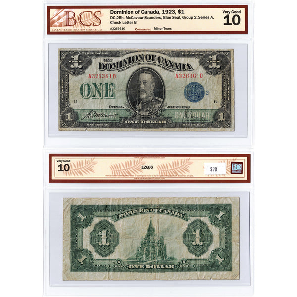 Available for sale is a $1 1923 Dominion of Canada Note Blue Seal Series A DC-25h - BCS VG-10